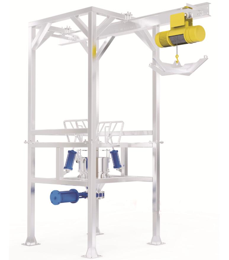 由提升機(jī)將噸袋提升至設(shè)備的進(jìn)料口,由破袋機(jī)打開噸袋下料口,將噸袋內(nèi)物料導(dǎo)入下料口,打開振動裝置震動輔助下料,促進(jìn)噸袋內(nèi)的物料靠重力進(jìn)入攪拌機(jī)或輸送皮帶,卸料完成后,吊出空袋,來完成整個拆包卸料過程。